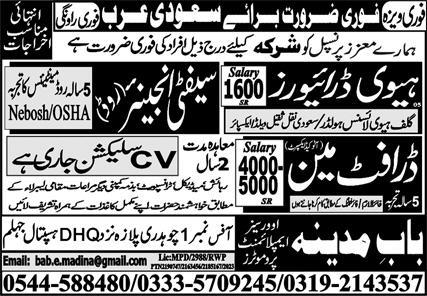 Bab e Madina Overseas Employment Promoters Riyadh, riyadh Saudi Arabia invites applications from eligible candidates for the post of safety engineer, heavy driver and draftsman as per advertisement of January 10, 2024 published in daily Express Newspaper. Matric, Bachelor and Intermediate etc. educational qualification will be preferred.
