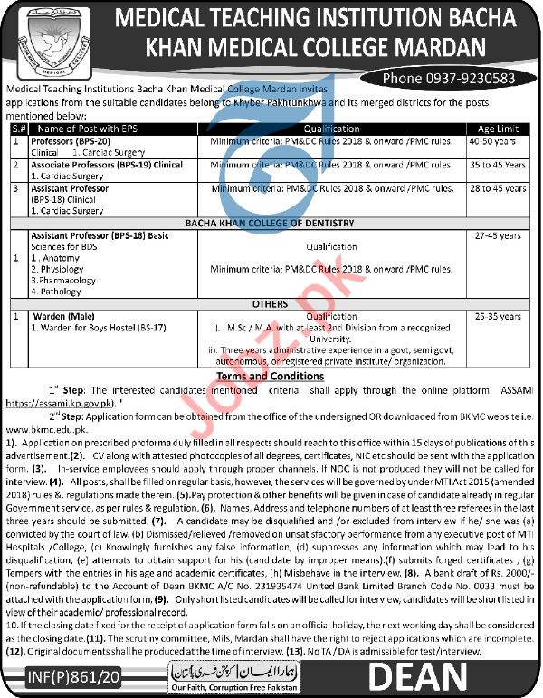 Medical Teaching Institution MTI Bacha Khan Medical College Mardan KPK invites applications from medical, health, mbbs, doctors and experienced candidates for the posts of Clinical Professor, Cardiac Surgery Professor, Clinical Associate Professor, Anatomy Assistant Professor, Physiology Assistant Professor, Pharmacology Assistant Professor, Pathology Assistant Professor and Hostel Warden.