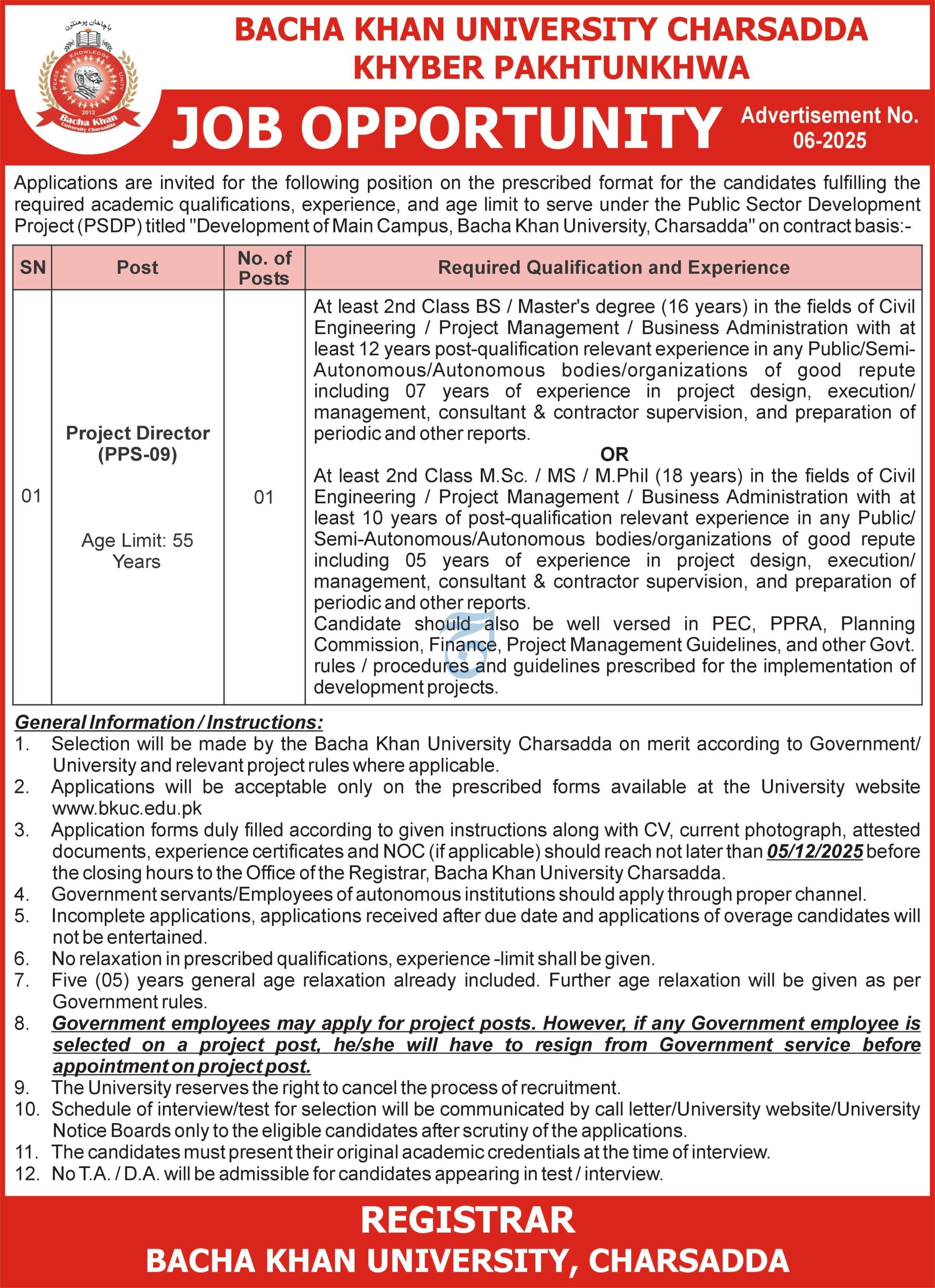 Vacant posts including project director are announced in Bacha Khan University Charsadda, charsadda Khyber Pakhtunkhwa KPK Pakistan as per 20 November 2025 advertisement in daily Aaj Newspaper. Candidates with Master, MS, Mphil, Bachelor and M.sc etc. educational background will be preferred.