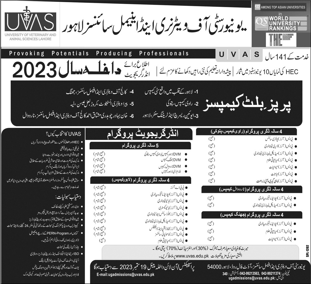 University of Veterinary and Animal Sciences UVAS Bachelor Programs, DVM admissions 2023 has been started. Students who want to take admissions in University of Veterinary and Animal Sciences UVAS Lahore Punjab Pakistan for academic year 2023 to continue education in Science University can apply. Students who want to enroll for academic session 2023 in DVM and Bachelor qualification and admission criteria for Government institute can apply till last date 20 September 2023. Read newspaper ad for exact details.