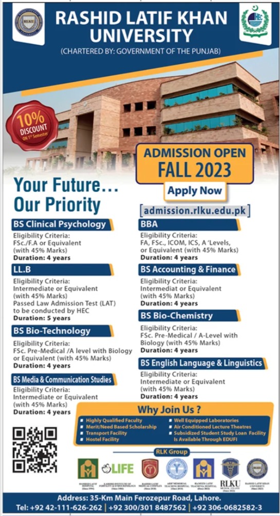 Rashid Latif Khan University admissions 2023 for BS Clinical Psychology, LLB, BS Bio Technology, BS Media and Communication Studies, BBA, BS Accounting and Finance, BS Bio Chemistry, BS English Language and Linguistics has been announced. Eligible students who qualify as per admission criteria in Rashid Latif Khan University Lahore Punjab Pakistan can apply in Science University for academic year 2023. Eligible candidates for admissions in Bachelor, LLb and BS can apply as per Private institute criteria and before closing date 11 July 2023 after reading advertisement online. Read newspaper ad for exact details.
