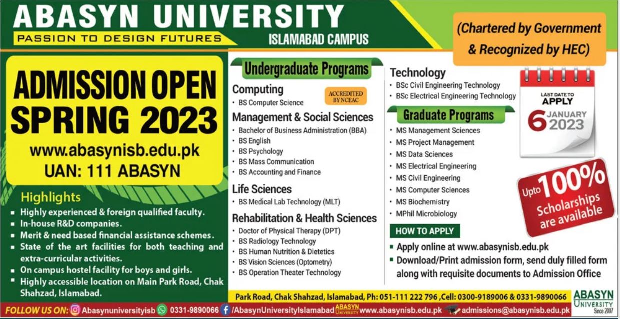 ABASYN University has announced admissions 2022 for BS Computer Science, BS English, Bachelor of Business Administration BBA, BS English, BS Psychology, BS Mass Communication, BS Accounting and Finance, BS Medical Lab Technology, MS Management Sciences, MS Project Management. Eligible students can apply for academic admissions 2022 in ABASYN University Islamabad Islamabad Pakistan for Management University. Students for admissions in MCS, MS, BCS, BS and B.E & criteria can apply as per Private institute admission policy 2022 before closing date January 6, 2023 as per advertisement. Read newspaper ad for exact details.