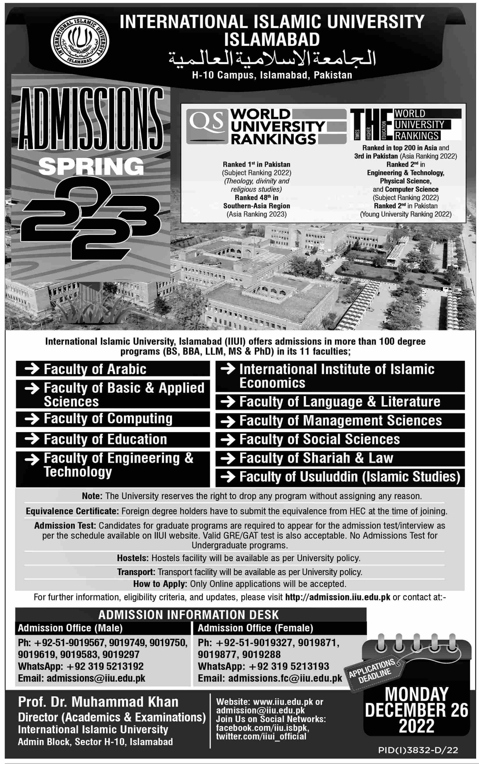 International Islamic University Islamabad IIUI has announced admissions 2022 for Faculty of Arabic, Faculty of Basic and Applied Sciences, Faculty of Computing, Faculty of Education, Faculty of Engineering and Technology, International Institute of Islamic Economics. Students who want to take admissions in International Islamic University Islamabad IIUI Islamabad Islamabad Pakistan for academic year 2022 to continue education in Science University can apply. Students for admissions in Bachelor and Master & criteria can apply as per Private institute admission policy 2022 before closing date December 26, 2022 as per advertisement. Read newspaper ad for exact details.