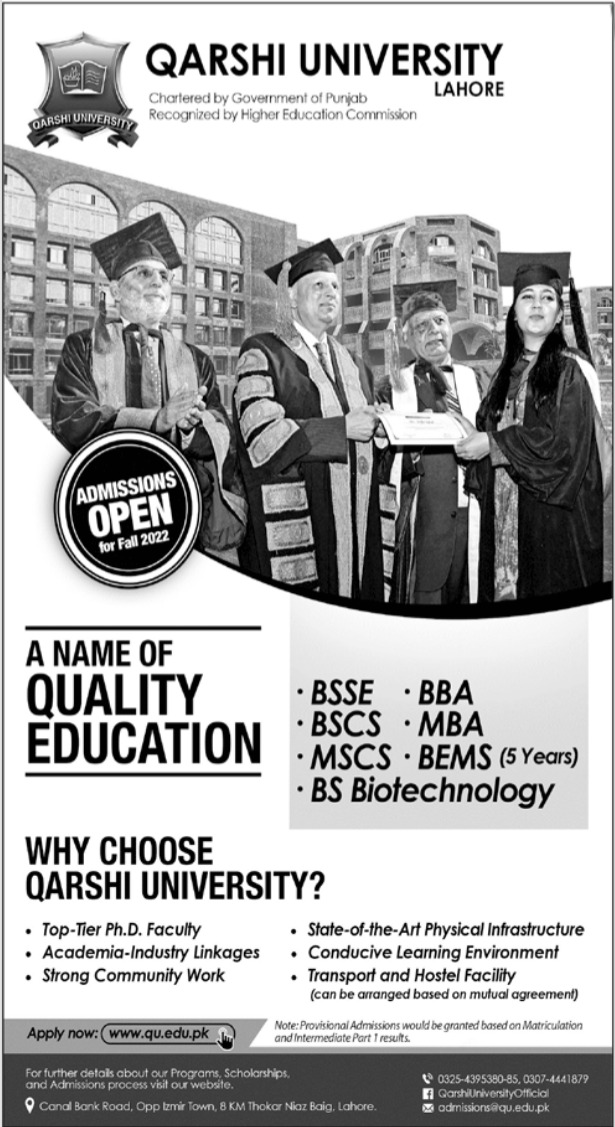 Qarshi University has announced admissions 2022 for BSSE, BBA, BSCS, MBA, MSCS, BEMS, BS Biotechnology. Qarshi University Lahore Punjab Pakistan welcomes students to apply for admissions in academic year 2022 in Management University. Students for admissions in BS, BCS, BBA, MBA, Bachelor, MCS and Master & criteria can apply as per Private institute admission policy 2022 before closing date July 19, 2022 as per advertisement. Read newspaper ad for exact details.