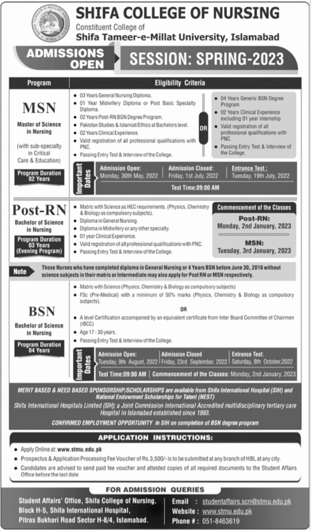 Admissions in Shifa Tameer e Millat University STMU 2022 for Bachelor of Science of Nursing BSN, Bachelor of Science in Nursing Post RN, Master of Science in Nursing MSN has been announced. Students can enroll for admissions in Shifa Tameer e Millat University STMU Islamabad Islamabad Pakistan for academic year 2022 to continue campus based or online education in Medical College. Eligible students for fulfilling criteria for admissions in Others, BSN and MSN can enroll as per Private admission policy 2022 till closing date 4 July 2022. Read newspaper ad for exact details.
