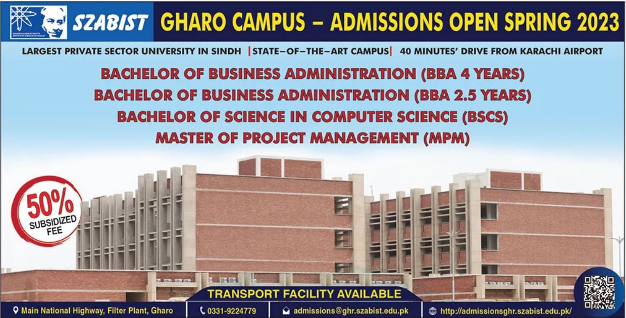 Shaheed Zulfiqar Ali Bhutto Institute of Technology SZABIST has announced admissions 2022 for Bachelor of Business Administration BBA, Bachelor of Science in Computer Science BSCS, Master of Project Management MPM. Students can enroll for admissions in Shaheed Zulfiqar Ali Bhutto Institute of Technology SZABIST Thatta Sindh Pakistan for academic year 2022 to continue campus based or online education in Management University. Eligible students for fulfilling criteria for admissions in BBA, BCS and Master can enroll as per Private admission policy 2022 till closing date 9 January 2023. Read newspaper ad for exact details.