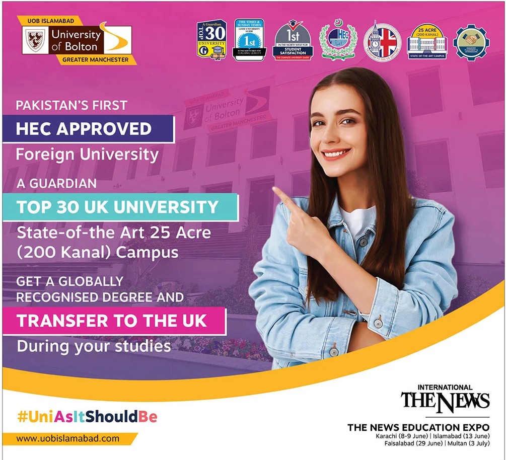 University of Bolton Bachelor Program, Master Program admissions 2024 has been started. Eligible students can apply for academic admissions 2024 in University of Bolton Islamabad Islamabad Pakistan for Science University. Eligible candidates for admissions in Bachelor and Master can apply as per Private institute criteria and before closing date 24 June 2024 after reading advertisement online. Read newspaper ad for exact details.