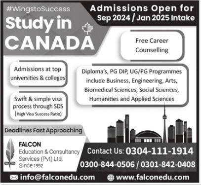 Falcon Education and Consultancy Services has announced admissions 2024 for Bachelor Programs, Master Programs. Falcon Education and Consultancy Services Canada Canada welcomes students to apply for admissions in academic year 2024 in Science University. Students for admissions in Bachelor and Master can apply for online or campus classes as per International institute criteria till admission closing date May 7, 2024. Read newspaper ad for exact details.