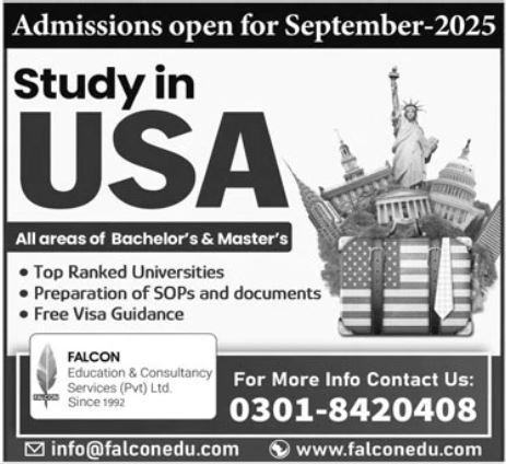 Admissions in Falcon Education and Consultancy Services 2024 for Bachelor, Master has been announced. Students who want to take admissions in Falcon Education and Consultancy Services Washington DC USA for academic year 2024 to continue education in Science University can apply. Eligible candidates for admissions in Bachelor and Master can apply as per International institute criteria and before closing date 30 December 2024 after reading advertisement online. Read newspaper ad for exact details.