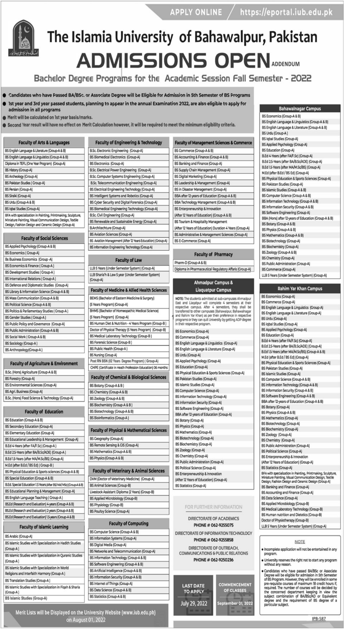 The Islamia University of Bahawalpur has announced admissions 2022 for bs history, bs mass communication, bsc civil engineering, bs urdu. Students who want to take admissions in The Islamia University of Bahawalpur Bahawalpur Punjab Pakistan for academic year 2022 to continue education in Management University can apply. Students for admissions in Bachelor and Intermediate & criteria can apply as per Private institute admission policy 2022 before closing date as per advertisement. Read newspaper ad for exact details.