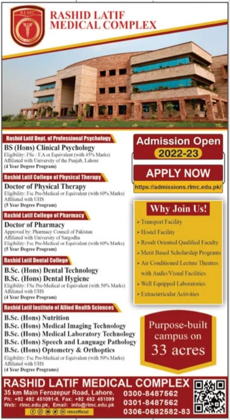 Rashid Latif Medical Complex RLMC has announced admissions 2022 for BSc Hons Nutrition BSc Medical Imaging Technology, BSc Medical Laboratory Technology, BS Speech and Language Pathology, Doctor of Physical Therapy DPT, Doctor of Pharmacy Pharm D. Eligible students can apply for academic admissions 2022 in Rashid Latif Medical Complex RLMC Lahore Punjab Pakistan for Medical University. Eligible students for fulfilling criteria for admissions in Pharm D, Bachelor, BS and DPT can enroll as per Private admission policy 2022 till closing date 18 January 2023. Read newspaper ad for exact details.