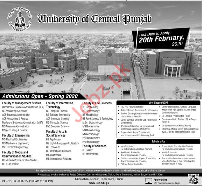 University of Central Punjab UCP invites applications for Spring Admissions 2020-2021 for the degree of BBA, MSc, BSC, MBA, MCS, MS, M.Phil, PhD in Lahore. All Student Submit Their Admissions form before deadline. Read newspaper ad for exact details.