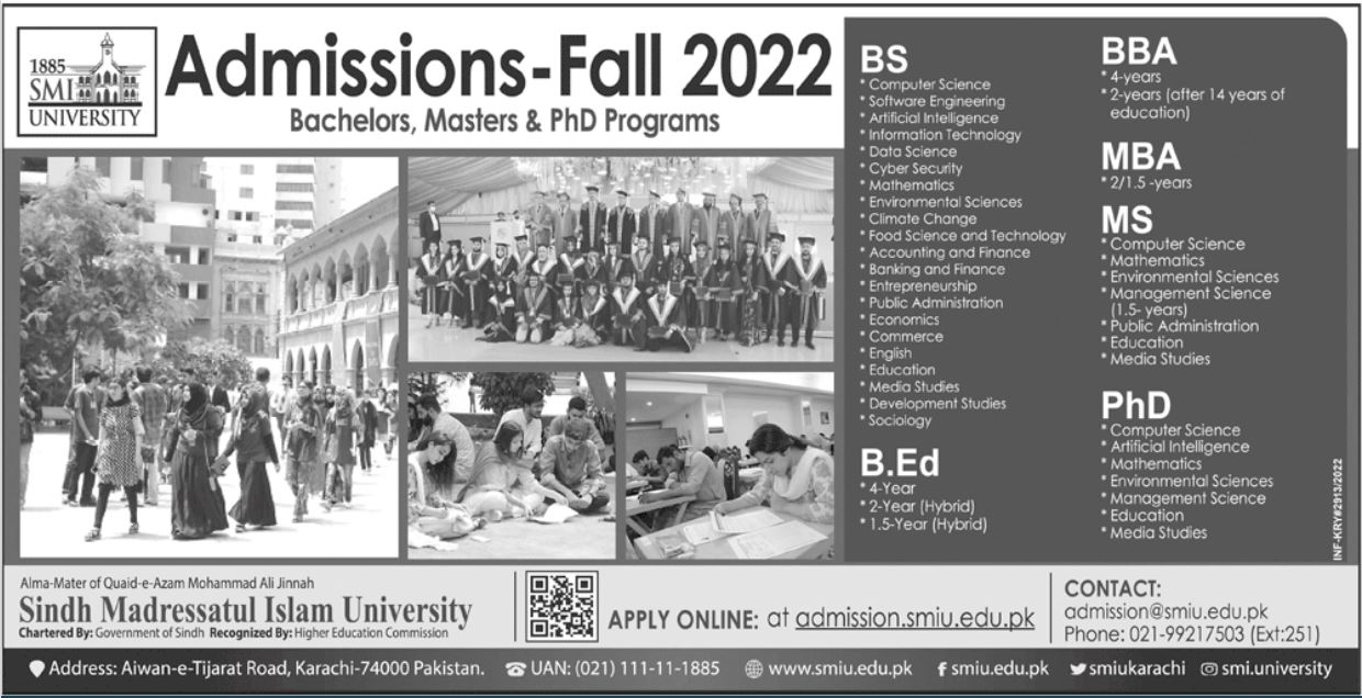 Sindh Madressatul Islam University BS, B.Ed, BBA, MBA, MS, PhD admissions 2022 has been started. Sindh Madressatul Islam University Karachi Sindh Pakistan welcomes students to apply for admissions in academic year 2022 in Science University. Eligible students for fulfilling criteria for admissions in MBA, BS, MS, Phd and B.ed can enroll as per Government admission policy 2022 till closing date 26 July 2022. Read newspaper ad for exact details.