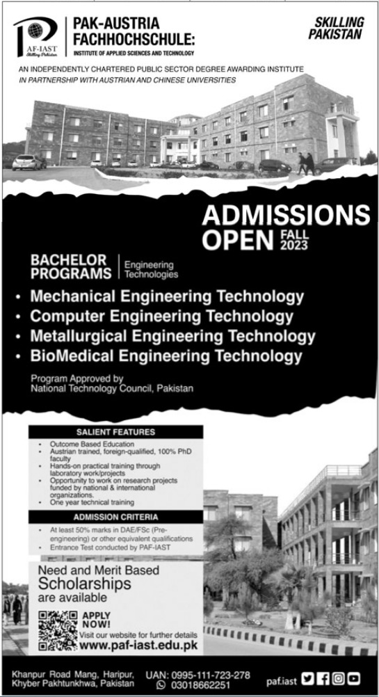 Pak Austria Fachhochschule Institute of Applied Sciences & Technology Bachelor of Mechanical Engineering, Bachelor of Computer Engineering, Bachelor of Metallurgical Engineering, Bachelor of Biomedical Engineering admissions 2023 has been started. Eligible students who qualify as per admission criteria in Pak Austria Fachhochschule Institute of Applied Sciences & Technology Haripur Khyber Pakhtunkhwa KPK Pakistan can apply in Science University for academic year 2023. Students for admissions in B.E, Bachelor and BS & criteria can apply as per Private institute admission policy 2023 before closing date September 27, 2023 as per advertisement. Read newspaper ad for exact details.