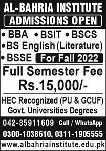 Al Bahria Institute BBA, BSIT, BSCS, BS English Literature, BSSE admissions 2022 has been started. Students who want to take admissions in Al Bahria Institute Lahore Punjab Pakistan for academic year 2022 to continue education in Management University can apply. Eligible candidates for admissions in BIT, Bachelor, BCS, BS and BBA can apply as per Private institute criteria and before closing date 21 June 2022 after reading advertisement online. Read newspaper ad for exact details.
