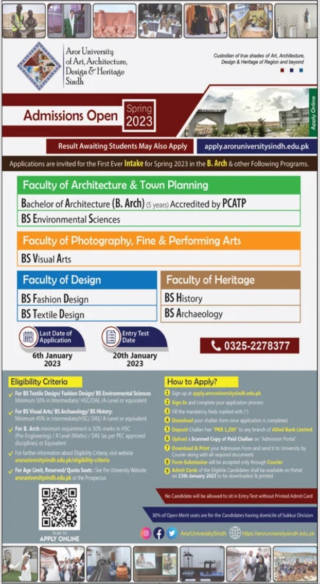 Aror University of Art Architecture Design & Heritage admissions 2022 for Bachelor of Architecture B.Arch, BS Environmental Sciences, BS Visual Arts, BS Fashion Design, BS History, BS Textile Design, BS Archaeology has been announced. Students can enroll for admissions in Aror University of Art Architecture Design & Heritage Sukkur Sindh Pakistan for academic year 2022 to continue campus based or online education in Management University. Students for admissions in BS and Bachelor & criteria can apply as per Private institute admission policy 2022 before closing date January 6, 2023 as per advertisement. Read newspaper ad for exact details.