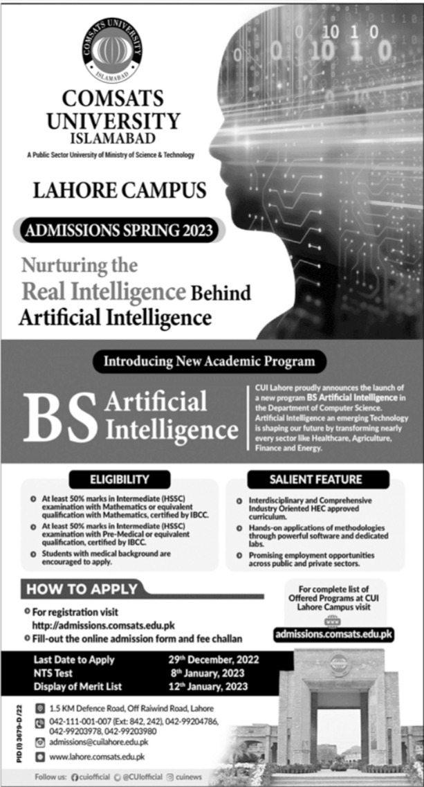 Comsats University has announced admissions 2022 for BS Artificial Intelligence. Eligible students can apply for academic admissions 2022 in Comsats University Lahore Punjab Pakistan for IT University. Students for admissions in BS can apply for online or campus classes as per Private institute criteria till admission closing date December 29, 2022. Read newspaper ad for exact details.