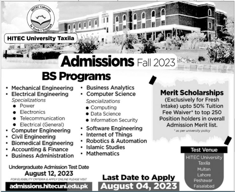 HITEC University Bachelor Program admissions 2023 has been started. Students can enroll for admissions in HITEC University Taxila Punjab Pakistan for academic year 2023 to continue campus based or online education in Science University. Students for admissions in Bachelor & criteria can apply as per Private institute admission policy 2023 before closing date August 4, 2023 as per advertisement. Read newspaper ad for exact details.