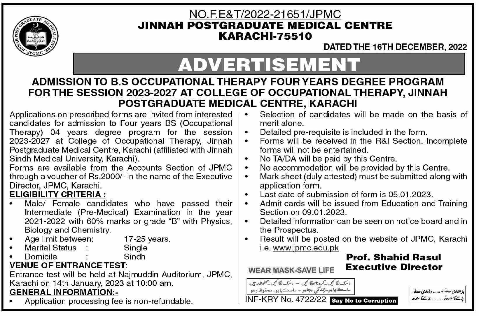 Jinnah Postgraduate Medical Center has announced admissions 2022 for BS Occupational Therapy. Students who want to take admissions in Jinnah Postgraduate Medical Center Karachi Sindh Pakistan for academic year 2022 to continue education in Medical University can apply. Students who want to enroll for academic session 2022 in BS qualification and admission criteria for Government institute can apply till last date 5 January 2023. Read newspaper ad for exact details.