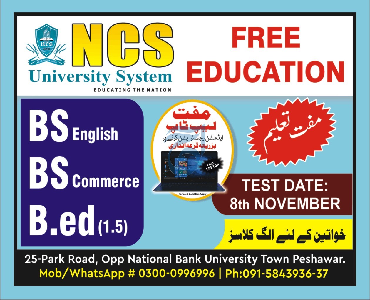 NCS University System BS English, BS Commerce, B.ed admissions 2024 has been started. NCS University System Peshawar Khyber Pakhtunkhwa KPK Pakistan welcomes students to apply for admissions in academic year 2024 in Science University. Eligible students for fulfilling criteria for admissions in BS and Bachelor can enroll as per Private admission policy 2024 till closing date 3 November 2024. Read newspaper ad for exact details.