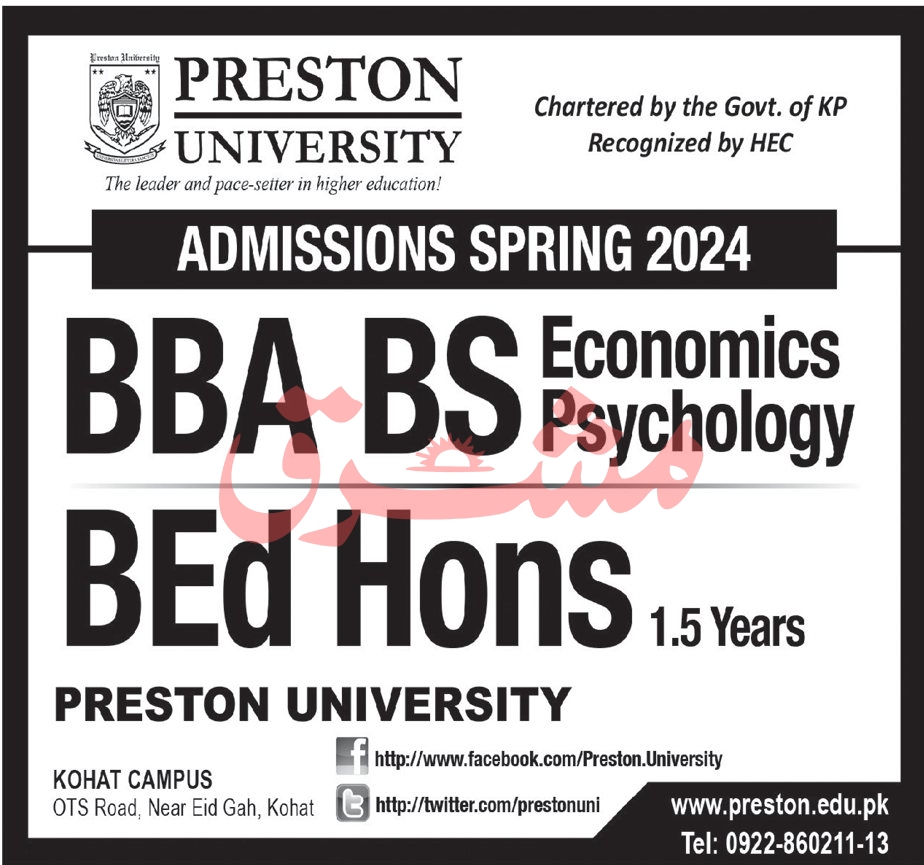 Preston University BBA, BS, B.Ed admissions 2024 has been announced. Students who want to take admissions in Preston University Kohat Khyber Pakhtunkhwa KPK Pakistan for academic year 2024 to continue education in Science University can apply. Students for admissions in B.ed, BBA and BS & criteria can apply as per Private institute admission policy 2024 before closing date February 14, 2024 as per advertisement. Read newspaper ad for exact details.