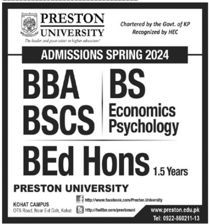 Preston University BBA, BS, BSCS, BEd admissions 2024 has been announced. Students who want to take admissions in Preston University Kohat Khyber Pakhtunkhwa KPK Pakistan for academic year 2024 to continue education in Science University can apply. Eligible candidates for admissions in B.ed, BBA, BCS and BS can apply as per Private institute criteria and before closing date 28 February 2024 after reading advertisement online. Read newspaper ad for exact details.