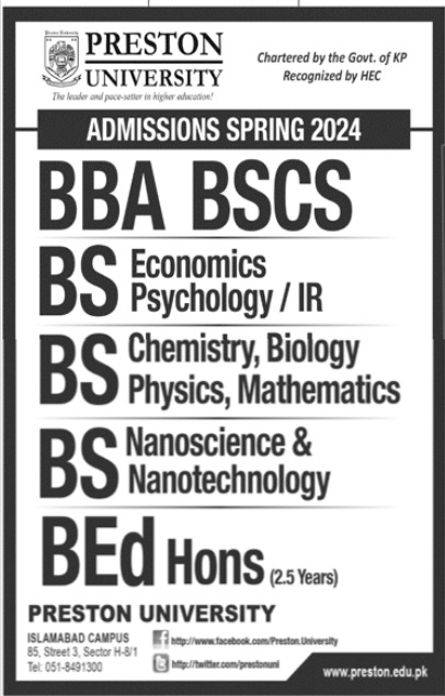 Preston University BBA, BSCS, BS, B.Ed admissions 2024 has been started. Students can enroll for admissions in Preston University Islamabad Islamabad Pakistan for academic year 2024 to continue campus based or online education in Science University. Students for admissions in BCS, B.ed, BBA and BS can apply for online or campus classes as per Private institute criteria till admission closing date March 11, 2024. Read newspaper ad for exact details.