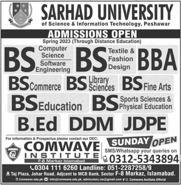 Admissions in Sarhad University of Science & Information Technology 2023 for BS, B.Ed DDM. JDPE has been announced. Eligible students who qualify as per admission criteria in Sarhad University of Science & Information Technology Islamabad Islamabad Pakistan can apply in Management University for academic year 2023. Students who want to enroll for academic session 2023 in B.ed, Others and BS qualification and admission criteria for Private institute can apply till last date 12 April 2023. Read newspaper ad for exact details.