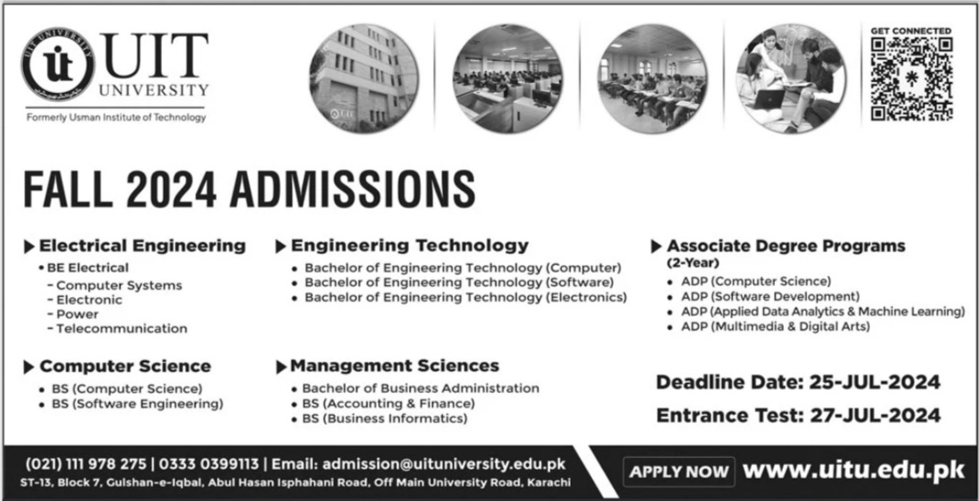 UIT University BE, BS, BSCS. BBA admissions 2024 has been announced. Eligible students who qualify as per admission criteria in UIT University Karachi Sindh Pakistan can apply in Science University for academic year 2024. Students for admissions in BS, BBA, B.E and BCS can apply for online or campus classes as per Private institute criteria till admission closing date July 25, 2024. Read newspaper ad for exact details.