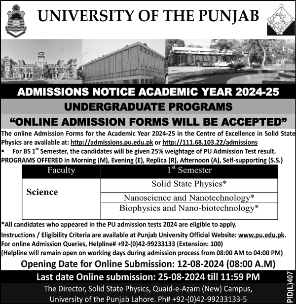 University Of The Punjab PU Bachelor Programs admissions 2024 has been started. Students who want to take admissions in University Of The Punjab PU Lahore Punjab Pakistan for academic year 2024 to continue education in Science University can apply. Students for admissions in Bachelor & criteria can apply as per Government institute admission policy 2024 before closing date August 25, 2024 as per advertisement. Read newspaper ad for exact details.