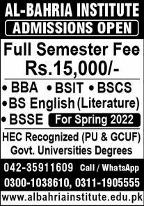 Al Bahria Institute BBA, BSIT, BSCS, BS English, BSSE admissions 2022 has been started. Eligible students who qualify as per admission criteria in Al Bahria Institute Lahore Punjab Pakistan can apply in Science University for academic year 2022. Eligible candidates for admissions in BIT, BBA, BCS and BS can apply as per Private institute criteria and before closing date 6 April 2022 after reading advertisement online. Read newspaper ad for exact details.