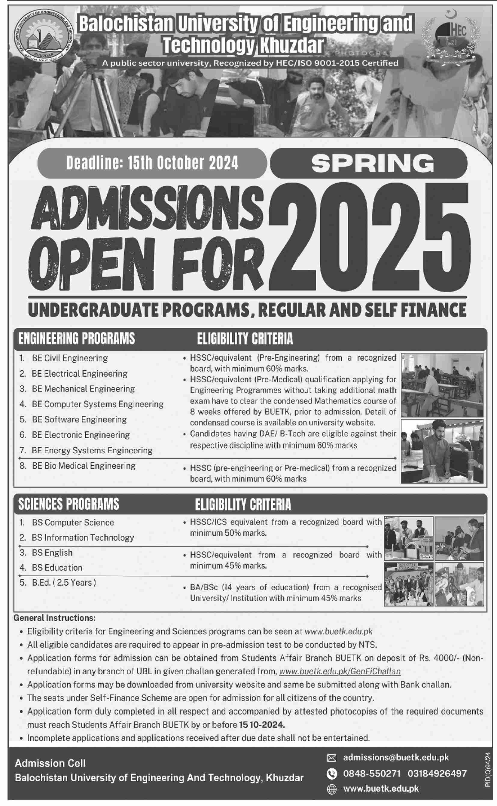 Admissions in Balochistan University of Engineering and Technology 2024 for B.E, BSCS, BS, B.Ed has been announced. Students can enroll for admissions in Balochistan University of Engineering and Technology Khuzdar Balochistan Pakistan for academic year 2024 to continue campus based or online education in Science University. Students for admissions in B.E, BCS, BS and B.ed & criteria can apply as per Government institute admission policy 2024 before closing date October 15, 2024 as per advertisement. Read newspaper ad for exact details.