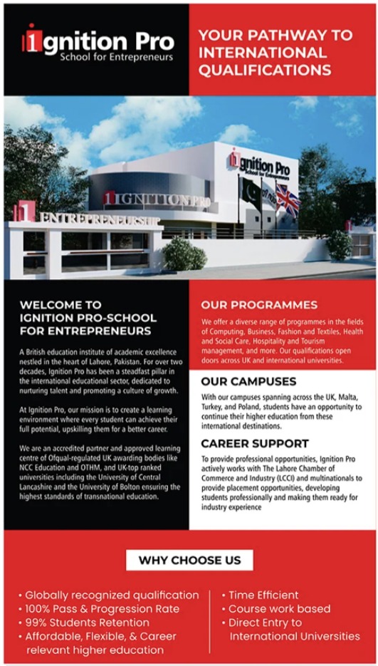 Ignition Pro School for Entrepreneurs Bachelor Programs admissions 2024 has been started. Students who want to take admissions in Ignition Pro School for Entrepreneurs London UK for academic year 2024 to continue education in Management University can apply. Eligible students for fulfilling criteria for admissions in Bachelor can enroll as per Government admission policy 2024 till closing date 22 July 2024. Read newspaper ad for exact details.