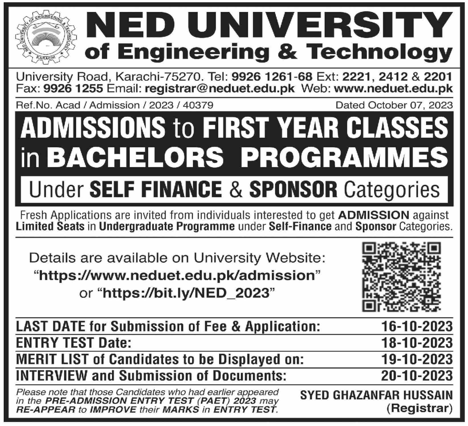 NED University of Engineering and Technology Bachelor Programs admissions 2023 has been started. Students can enroll for admissions in NED University of Engineering and Technology Karachi Sindh Pakistan for academic year 2023 to continue campus based or online education in Science University. Eligible candidates for admissions in BS and Bachelor can apply as per Government institute criteria and before closing date 16 October 2023 after reading advertisement online. Read newspaper ad for exact details.