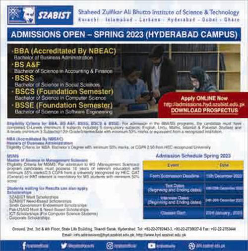 Shaheed Zulfiqar Ali Bhutto Institute of Technology SZABIST admissions 2022 for Bachelor of Business Administration BBA, Bachelor of Science in Accounting and Finance BS A&F, Bachelor of Science in Social Sciences BSSS, Bachelor of Science in Computer Science BSCS, Bachelor of Science in Software Engineering BSSE has been announced. Students can enroll for admissions in Shaheed Zulfiqar Ali Bhutto Institute of Technology SZABIST Hyderabad Sindh Pakistan for academic year 2022 to continue campus based or online education in Management University. Eligible students for fulfilling criteria for admissions in BBA, Bachelor and BS can enroll as per Private admission policy 2022 till closing date 11 December 2022. Read newspaper ad for exact details.