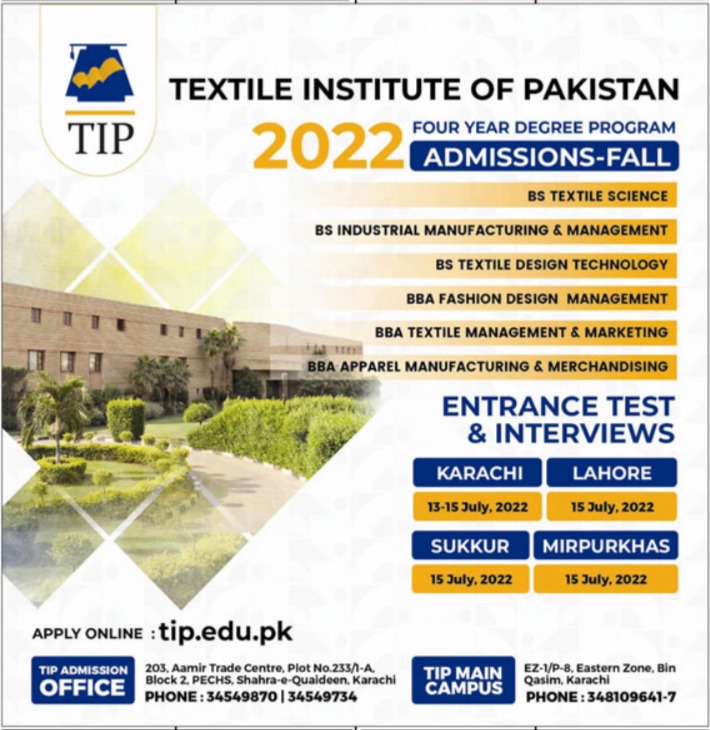 Textile Institute of Pakistan TIP BS Textile Science, BS Industrial Manufacturing and Management, BS Textile Design Technology, BBA Fashion Design Management, BBA Textile Management and Marketing, BBA Apparel Manufacturing and Merchanising admissions 2022 has been started. Eligible students who qualify as per admission criteria in Textile Institute of Pakistan TIP Karachi Sukkur, Lahore and Mirpur Khas Sindh Pakistan can apply in Management University for academic year 2022. Students for admissions in BS and BBA & criteria can apply as per Private institute admission policy 2022 before closing date June 15, 2022 as per advertisement. Read newspaper ad for exact details.