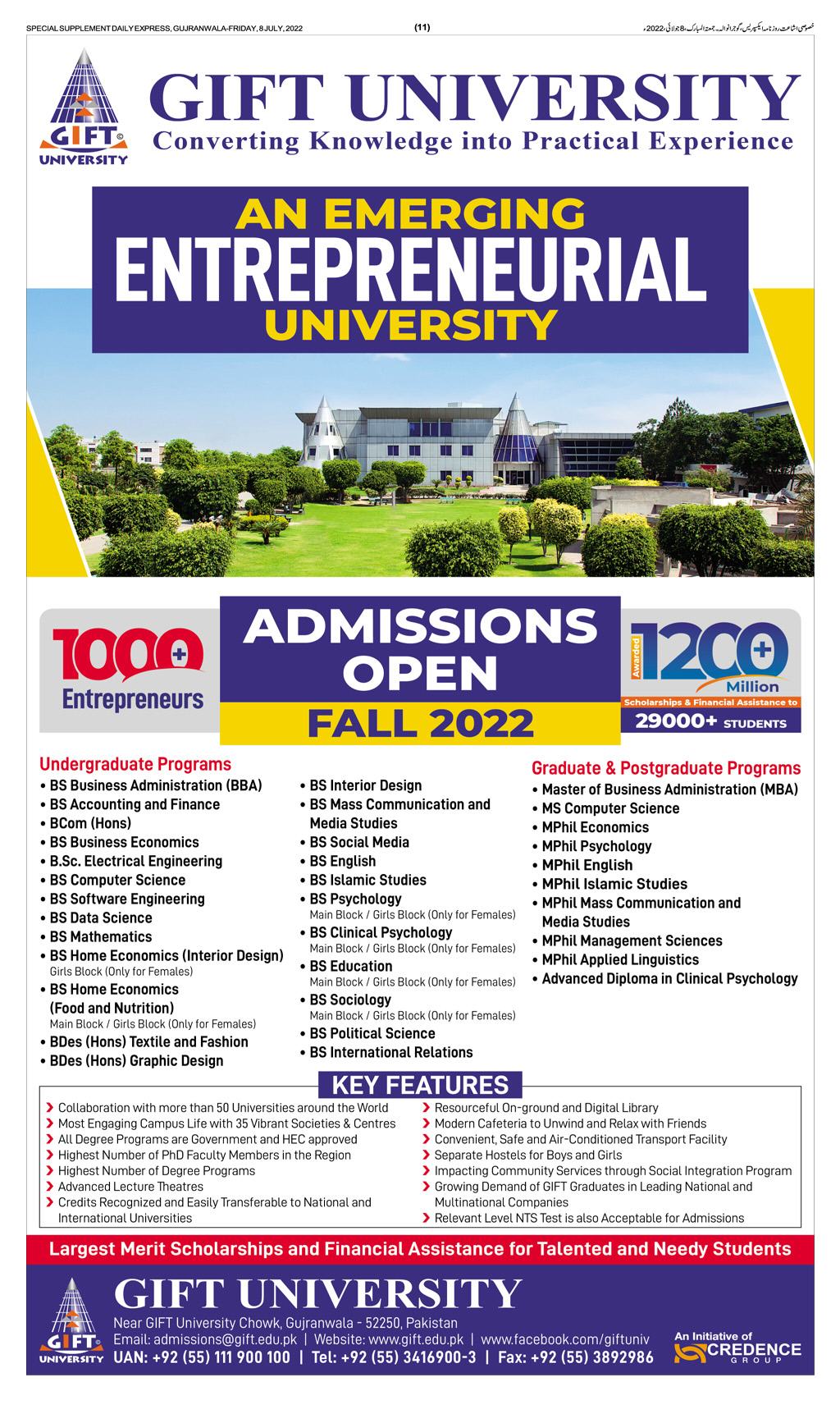Admissions in Gift University 2022 for BS, MS, MPhil, has been announced. Students who want to take admissions in Gift University Gujranwala Punjab Pakistan for academic year 2022 to continue education in Management University can apply. Students for admissions in Intermediate, Bachelor and Master & criteria can apply as per Private institute admission policy 2022 before closing date as per advertisement. Read newspaper ad for exact details.