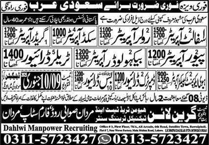 Green Line Human Resource Manpower jobs advertisement dated about 8 January 2025 in daily Express Newspaper invites application for the vacant post of paver operator, skid operator, roller operator, htv driver, asphalt operator, driver, bus driver, backhoe loader operator, trailer driver, dumper truck driver, grader operator and heavy equipment compactor operator in Riyadh, dammam Saudi Arabia. Preferred Education is Intermediate, Bachelor, Matric and DAE etc.