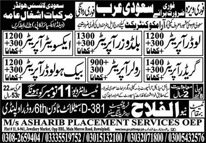 Asharib Placement Services Jeddah, riyadh Saudi Arabia invites applications from eligible candidates for the post of bulldozer operator, backhoe loader operator, excavator operator, grader operator, loader operator and roller operator as per advertisement of November 9, 2023 published in daily Express Newspaper. Candidates with Intermediate, DAE and Matric etc. educational background will be preferred.