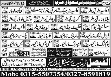 Al Faisal Trade Test & Technical Training Center latest Overseas Construction jobs and others can be applied till 21 July 2024 or as per closing date in newspaper ad. Read complete ad online to know how to apply on latest Al Faisal Trade Test & Technical Training Center job opportunities. Driving, 3D Rigging and Excavation skills may beneficial for these Al Faisal Trade Test & Technical Training Center jobs. Salary varies from 326000. Overtime might be allowed. Free accommodation, transport and medical may be available.