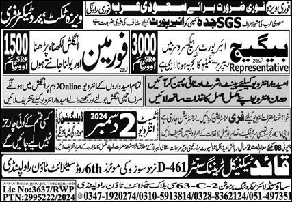 Quaid Technical Training Center jobs advertisement dated about 30 November 2024 in daily Express Newspaper invites application for the vacant post of baggage representative, baggage foreman and foreman in Jeddah, riyadh Saudi Arabia. Educational qualifications required Matric and Intermediate etc.