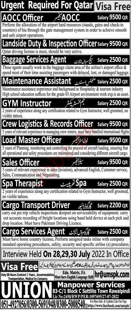 Union Manpower Services Qatar, qatar Qatar invites applications from eligible candidates for the post of records officer, crew logistics officer, sales officer, inspection officer, load master officer, spa therapist, landside duty officer, baggage services agent, aocc officer, gym instructor, maintenance assistant, cargo service agent and cargo transport driver as per advertisement of July 28, 2022 published in daily Express Newspaper. Preferred Education is Intermediate, Bachelor and Matric etc.