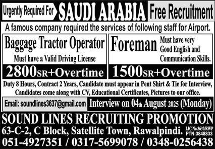 Vacant posts including foreman and baggage tractor operator are announced in Sound Lines Recruiting Promotion Riyadh, dammam Saudi Arabia as per 2 August 2025 advertisement in daily Express Newspaper. Educational qualifications required Bachelor, Intermediate, DAE, Matric and Others etc.