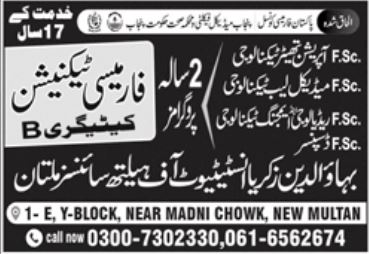 Bahauddin Zakariya Institute of Health Sciences FSc in Operations Theater Technology, Medical Lab Technology, Radiology & Imaging Technology, Dispenser, admissions 2023 has been announced. Bahauddin Zakariya Institute of Health Sciences Multan Punjab Pakistan welcomes students to apply for admissions in academic year 2023 in Medical Medical College. Students for admissions in Diploma, Intermediate and Course & criteria can apply as per Private institute admission policy 2023 before closing date December 5, 2023 as per advertisement. Read newspaper ad for exact details.