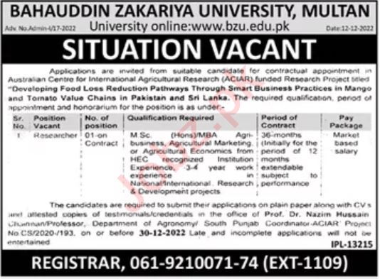 Bahauddin Zakariya University Multan BZU latest Government Research jobs and others can be applied till December 30, 2022 or as per closing date in newspaper ad. Read complete ad online to know how to apply on latest Bahauddin Zakariya University Multan BZU job opportunities.