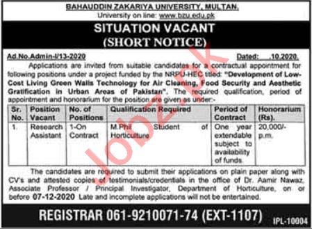 Latest Bahauddin Zakariya University Multan BZU Research Posts Multan 2025