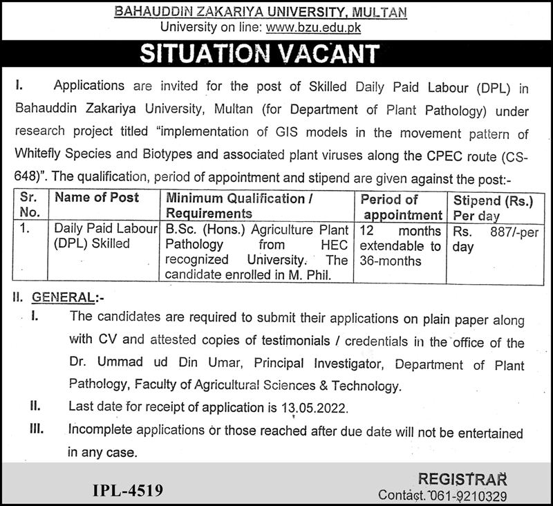 Bahauddin Zakariya University Multan BZU latest Government Labor jobs and others can be applied till May 13, 2022 or as per closing date in newspaper ad. Read complete ad online to know how to apply on latest Bahauddin Zakariya University Multan BZU job opportunities.