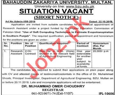 Bahauddin Zakariya University BZU Research Assistants Jobs