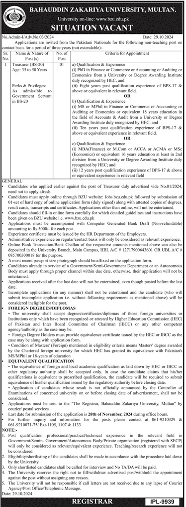 Bahauddin Zakariya University Multan BZU Multan, multan Punjab Pakistan invites applications from eligible candidates for the post of treasurer as per advertisement of November 5, 2024 published in daily Jang Newspaper. Candidates with Master, Mphil, Phd and Bachelor etc. educational background will be preferred.