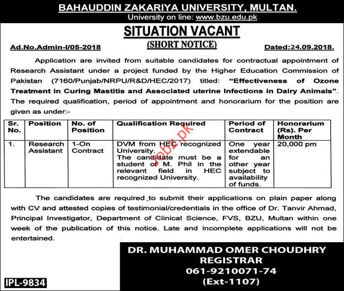 Bahauddin Zakriya University BZU Research Assistant Jobs